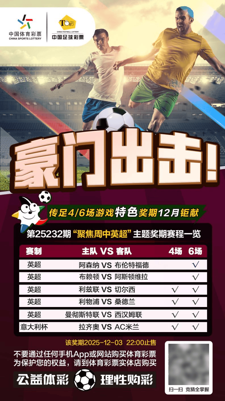 第25232期传足4/6场游戏特色奖期已经于2025年11月30日20:00开售,将于2025年12月3日22:00停售,并于12月05日开奖,其中利兹联VS切尔西、利物浦VS桑德兰、曼彻斯特联VS西汉姆联和拉齐奥VSAC米兰为4场进球游戏竞猜赛事。返回搜狐,查看更多