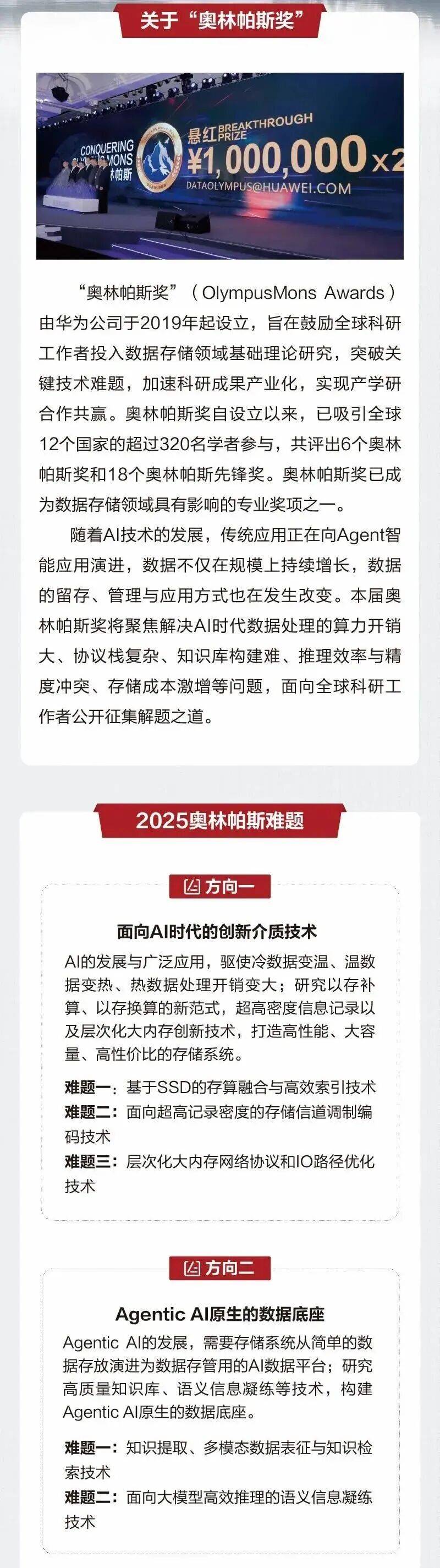 据财联社报道,昨天,华为第六届「奥林帕斯」全球征集活动正式启动,面向全球发布悬赏,聚焦解决 AI 时代的存储难题。