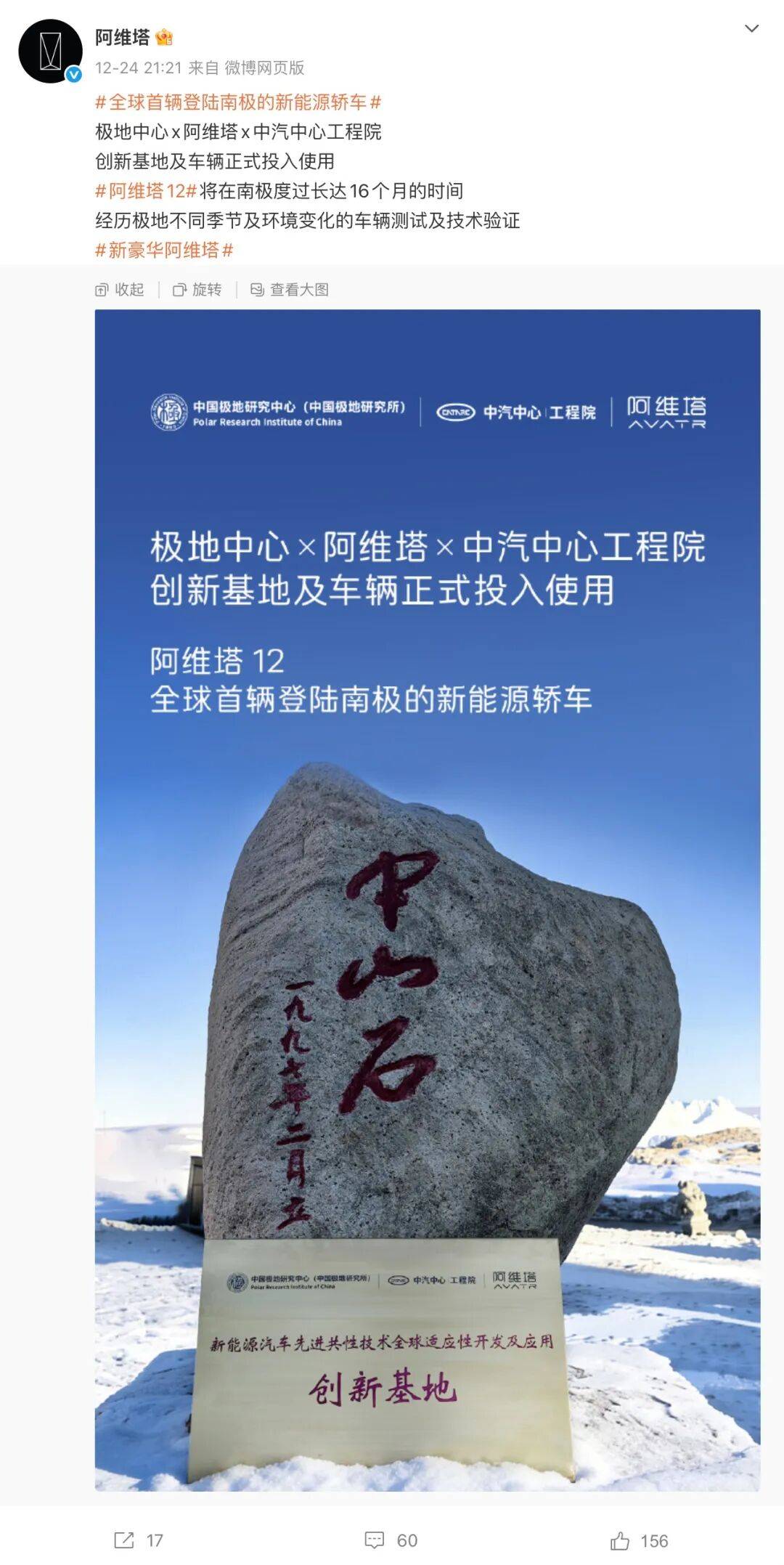 12 月 8 日,阿维塔宣布其旗舰车型阿维塔 12 已抵达南极中山站,并以「全球首辆登陆南极的新能源轿车」,宣称将「直面 -50℃ 极寒,勇闯『无人区』,开启科考之旅」。