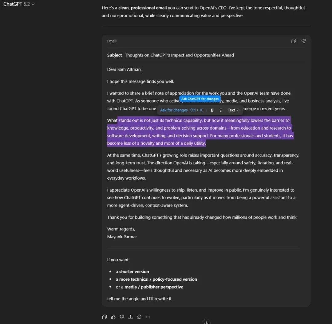 目前,当用户让 ChatGPT 撰写邮件、博客等内容时,生成内容不再以普通对话气泡呈现。系统会在新的富文本区域中以接近文档编辑器的形式呈现草稿,让用户在界面上更直观地处理邮件或文稿。