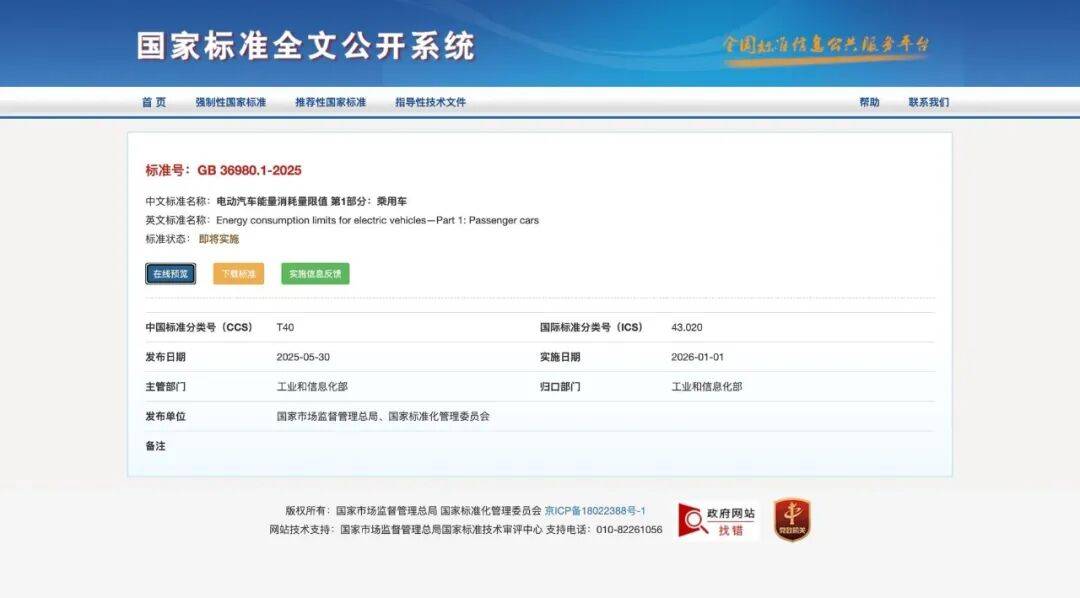 据新华社报道,国家强制性标准《电动汽车能量消耗量限值 第 1 部分:乘用车》(GB 36980.1-2025)将于明年 1 月 1 日正式实施。