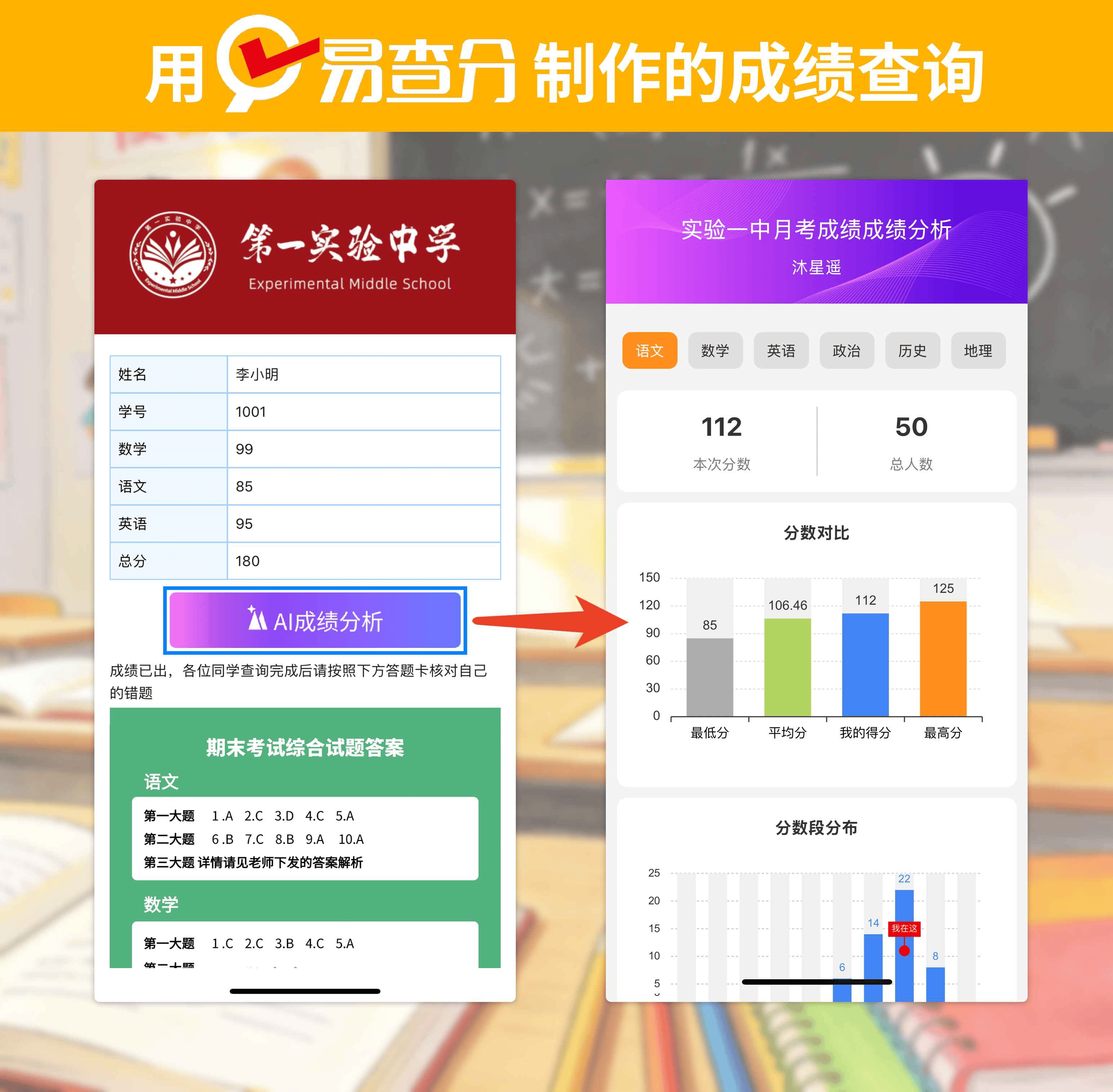 更重要的是其多重安全保障机制:【一个微信只能查一人】防止代查滥用;【锁定查询】功能可在设定时间后关闭入口;【个人密钥】确保只有输入正确信息才能获取结果;还有【签收后才能查看完整】的设计,让老师能确认每位家长均已查阅。此外,系统支持AI成绩分析,可自动统计最高分、最低分、平均分及各分数段人数分布,帮助教师快速掌握整体学情。