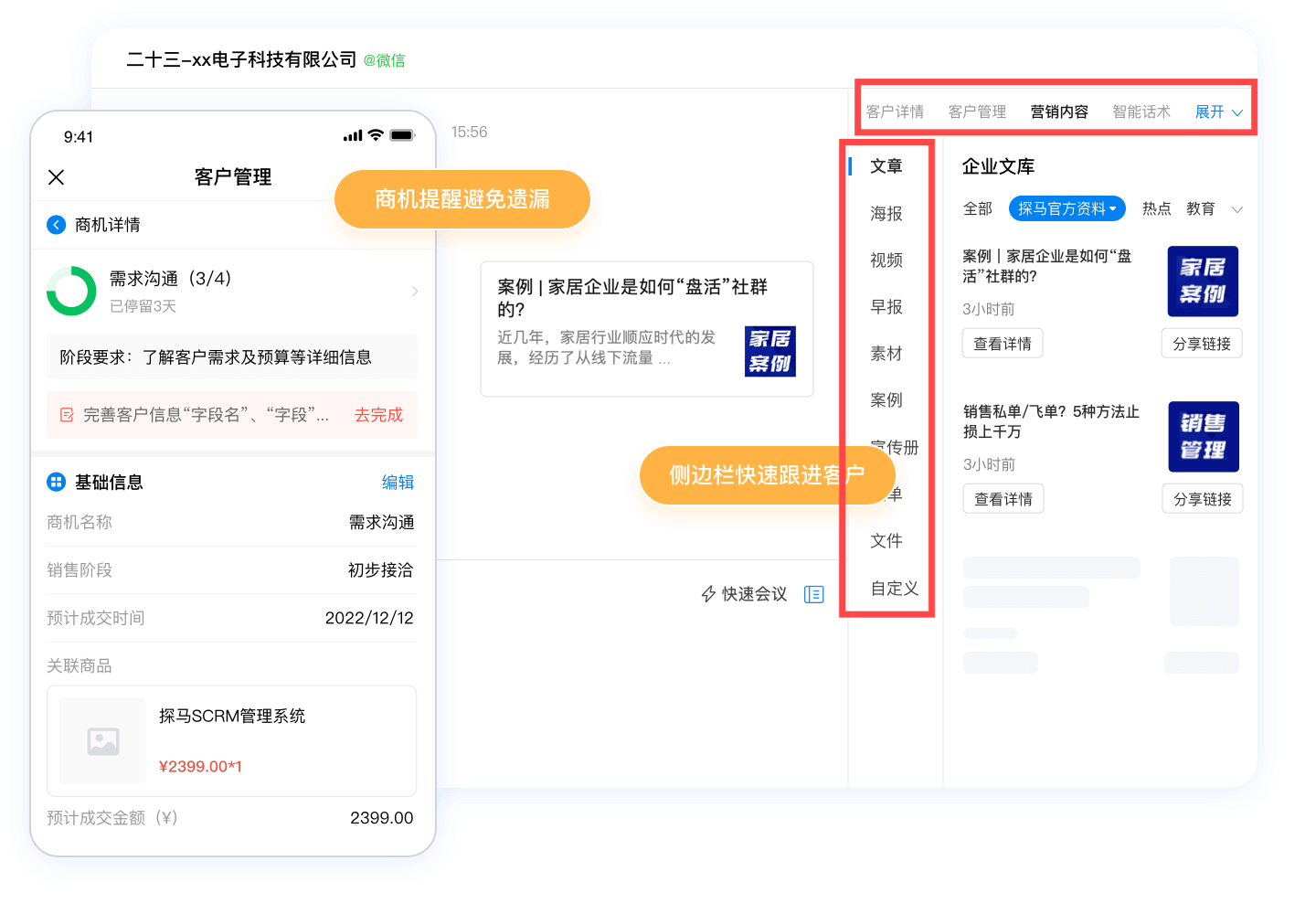 核心定位:轻量化社交化SCRM,主打“连接客户、赋能销售”,聚焦中小企业标准化销售流程,以简洁易用、高性价比为核心卖点,适配轻量级私域运营需求。