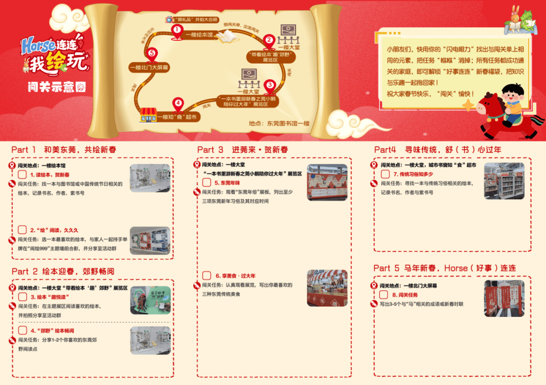 “Horse连连,我绘玩”活动一共安排了“和美东莞,共绘新春”“绘本迎春,郊野畅阅”“进莞来·贺新春”“寻味传统,舒(书)心过年”“马年新春,Horse(好事)连连”等5个环节,共8个闯关小任务。