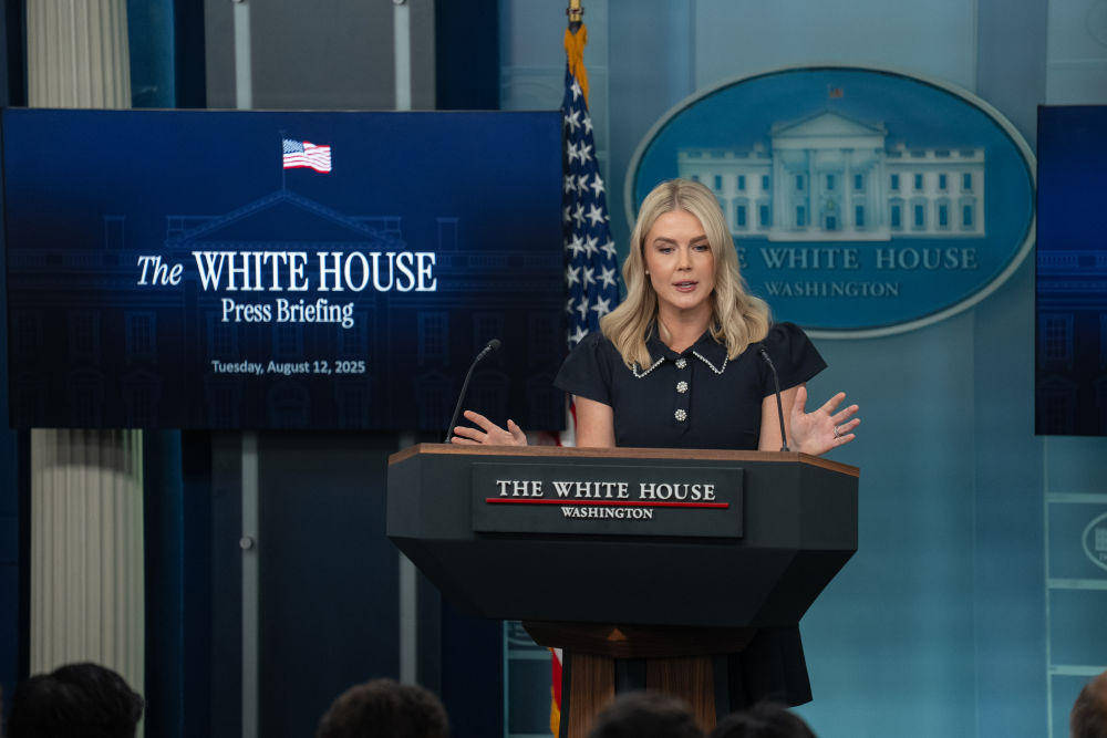 8月12日,在美国首都华盛顿白宫,白宫新闻秘书莱维特出席记者会。新华社记者胡友松摄