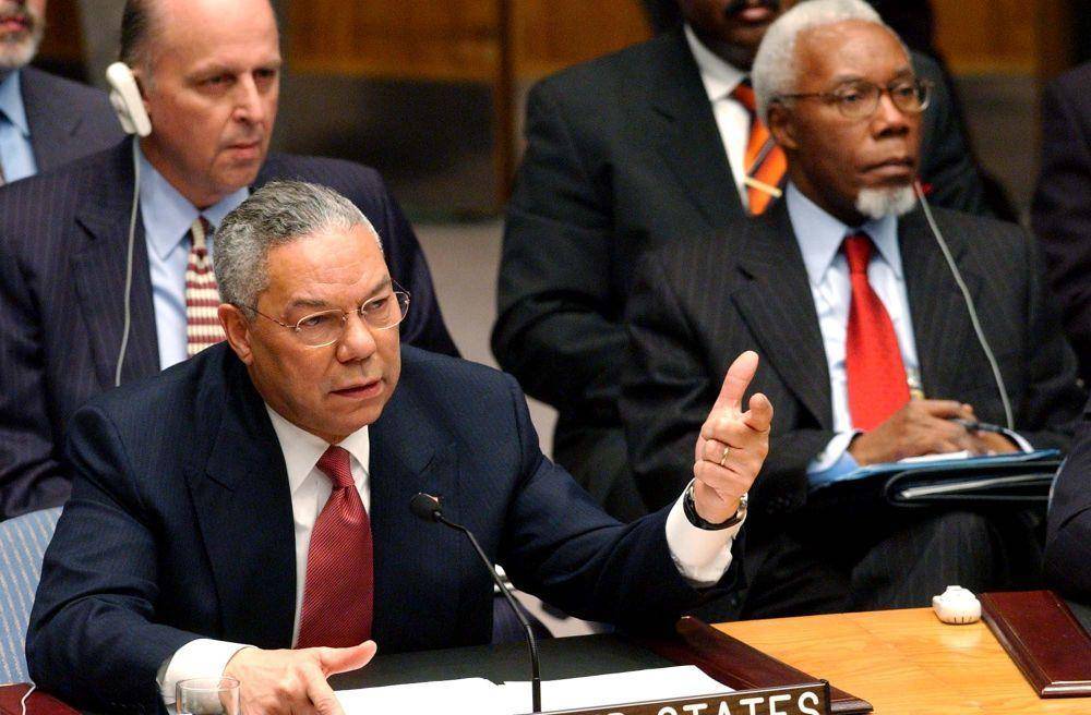 2003年2月5日,时任美国国务卿鲍威尔在联合国安理会就伊拉克问题举行的公开会议上向安理会通报有关伊拉克藏匿大规模杀伤性武器的所谓“证据”。 新华社记者彭张青摄(数码传真照片)